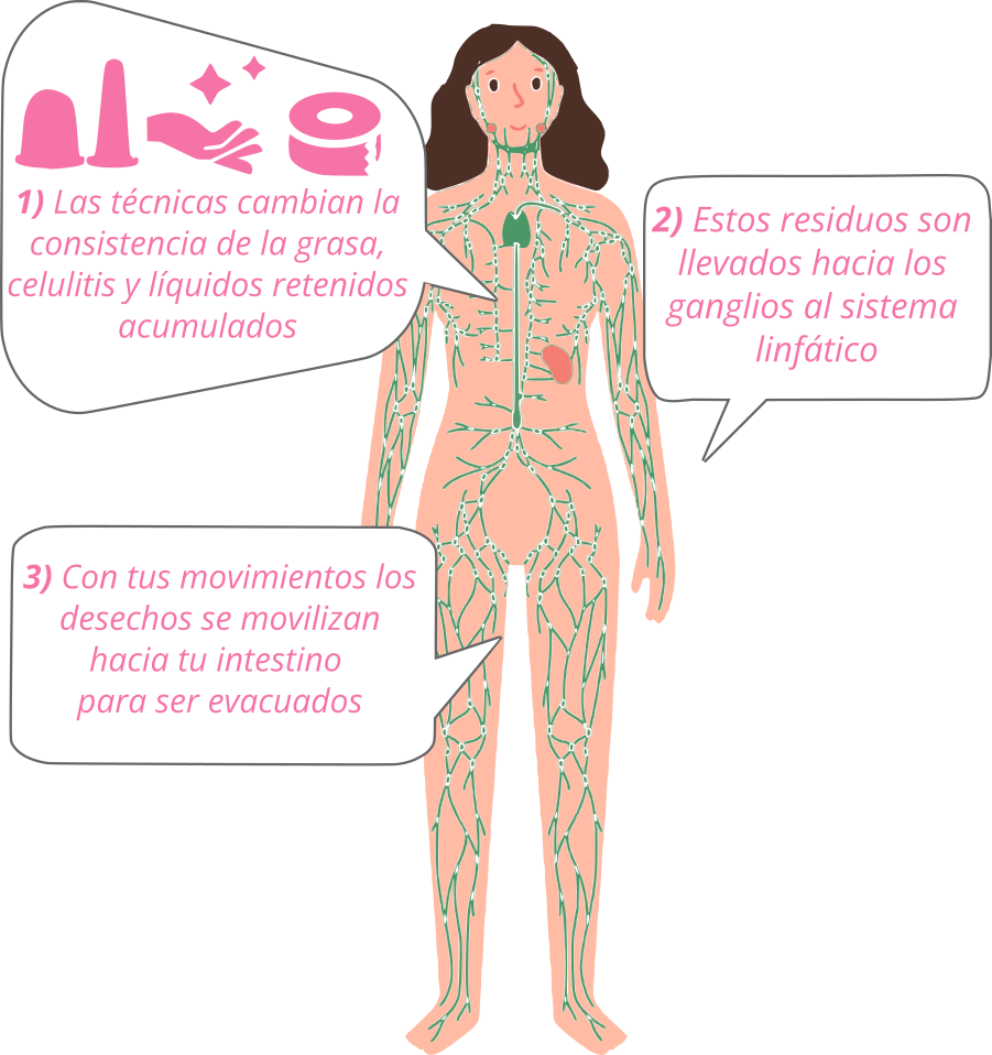 La aplicación de técnicas estimulan tu sistema linfático y cambia la consistencia de la grasa, celulitis y líquidos acumulados, para ayudar a moldear, drenar y llevar estos residuos hacia tus ganglios linfáticos.