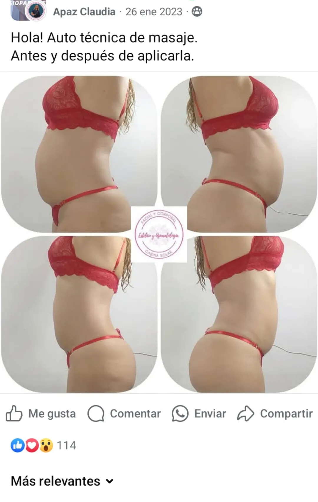 Me capacité con diferentes cursos y certificaciones de moldeado corporal y drenaje linfático estético, kinesiotape y cupping, practiqué y mejoré mil técnicas hasta lograr un buen protocolo, eficaz, eficiente, con resultados sorprendentes y ameno para el terapeuta, más fácil y ergonómico.
